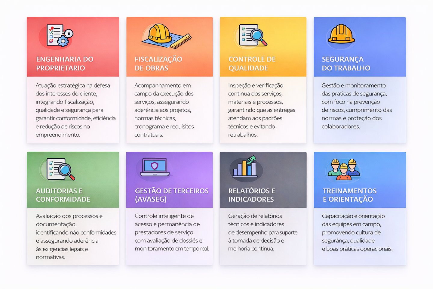 Somos uma empresa especializada em engenharia do proprietário, com foco em fiscalização de obras e gestão de Segurança do Trabalho, atuando em todo o território nacional.